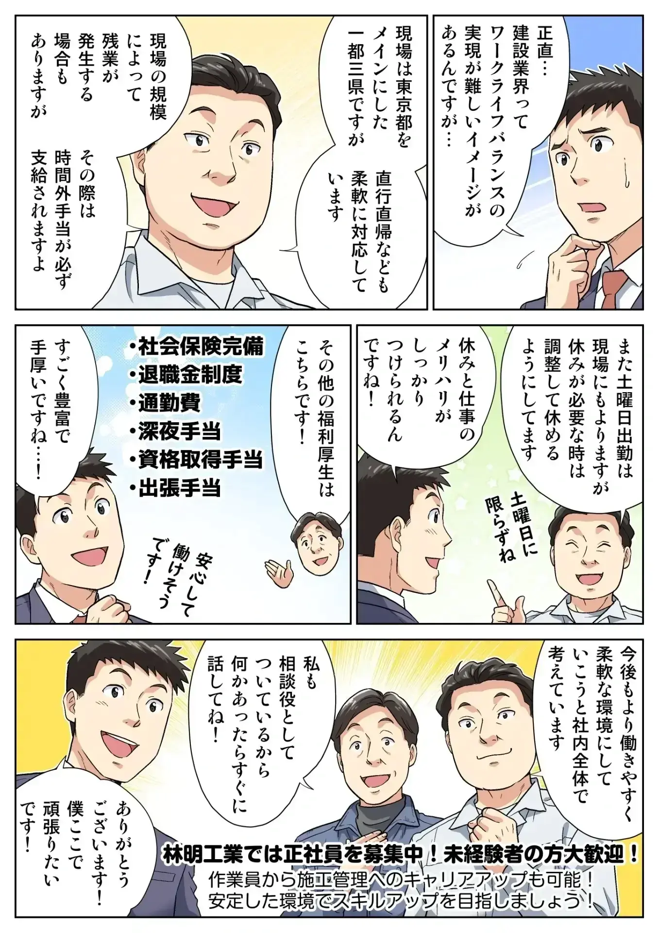 林明工業では、あなたのチャレンジ精神を歓迎します。経験の有無を問わず、安心して働ける教育体制と柔軟な働き方をサポートしています。家族やプライベートを大切にしながら、共に「安心・安全」を提供する仕事に取り組みましょう。皆様のご応募を心よりお待ちしております。